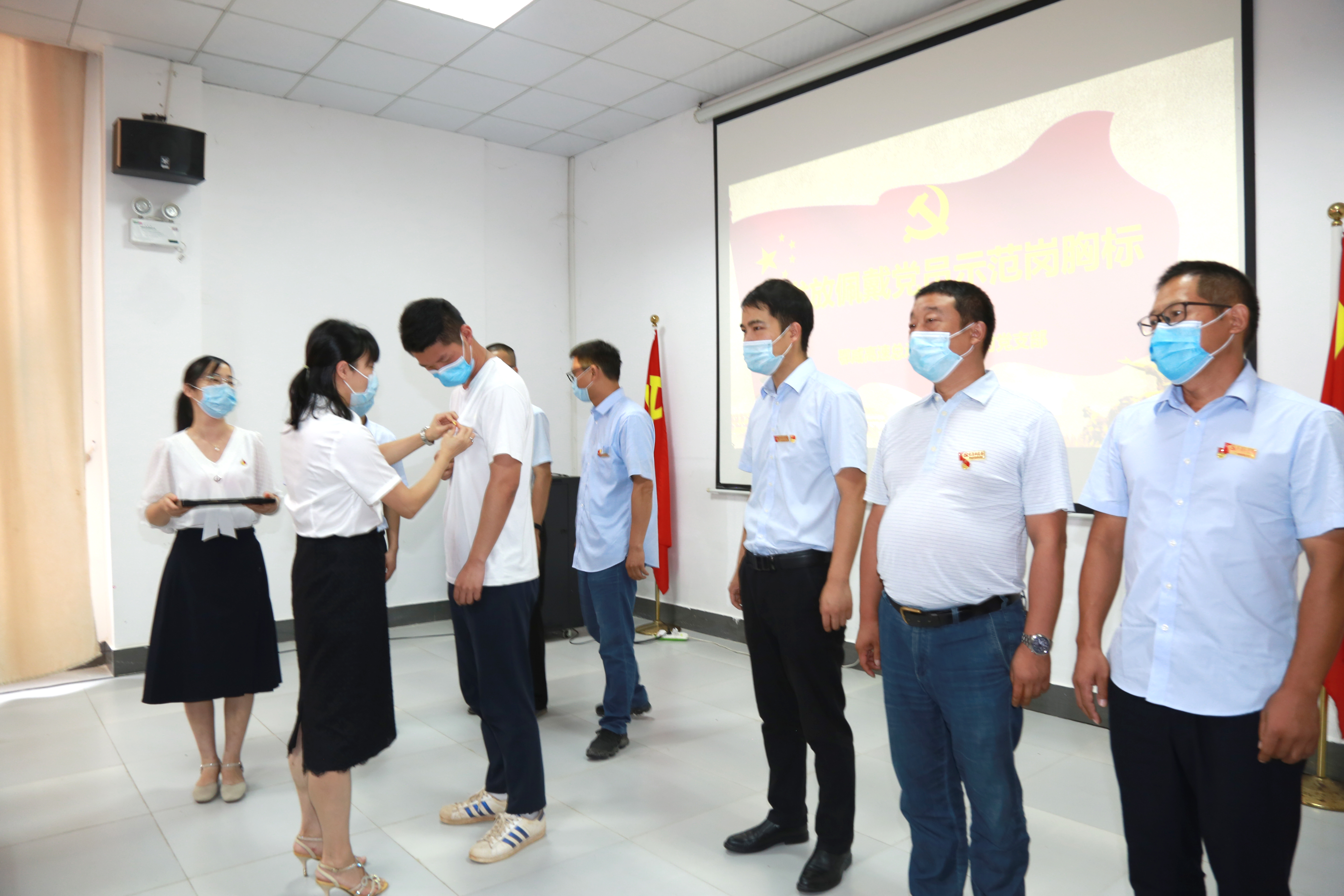 活動中,全體黨員重溫了入黨誓詞,共同學習了《鄂咸項目臨時黨支部黨員示范崗制度》及《關于成立鄂咸高速“攻堅突擊隊”的通知》文件,每名黨員鄭重簽訂了黨員示范崗承諾書。隨后,湖北路橋集團人力資源總監、紀委副書記李素英一一為示范崗黨員佩戴了示范崗胸牌,集團黨委委員、常務副總經理、鄂咸項目臨時黨支部書記李高磊為項目梁板架設、路面攤鋪、安全保障、協調維穩等七支攻堅突擊隊進行了授旗。
