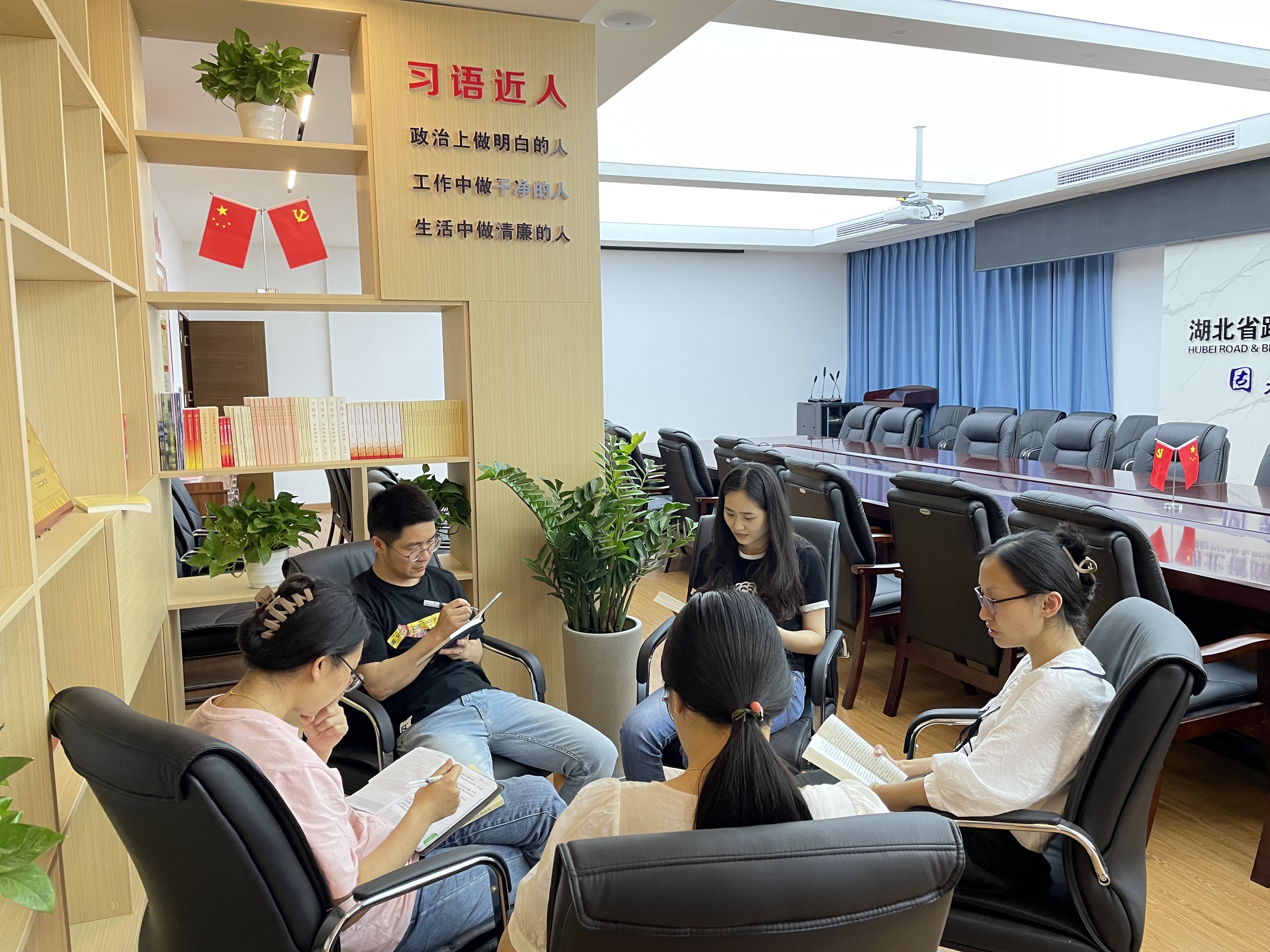 結(jié)合實際,交流思想,碰撞智慧,才能讓理論武裝走深走實。華晟通公司黨總支在黨員活動室中設(shè)立了“習語近人”讀書角,組織青年黨員、團員在此學原文、讀原著、悟原理,通過一人領(lǐng)讀,不斷思考領(lǐng)悟,夯實思想根基。