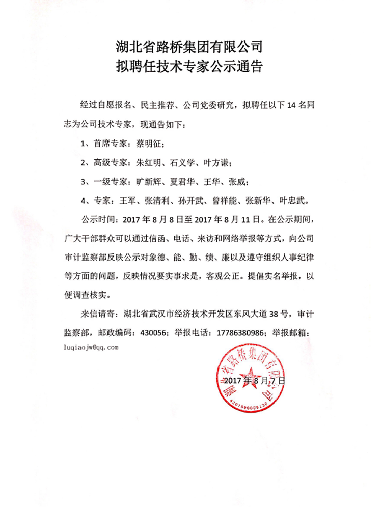 湖北省路橋集團有限公司擬聘任技術專家公示公告