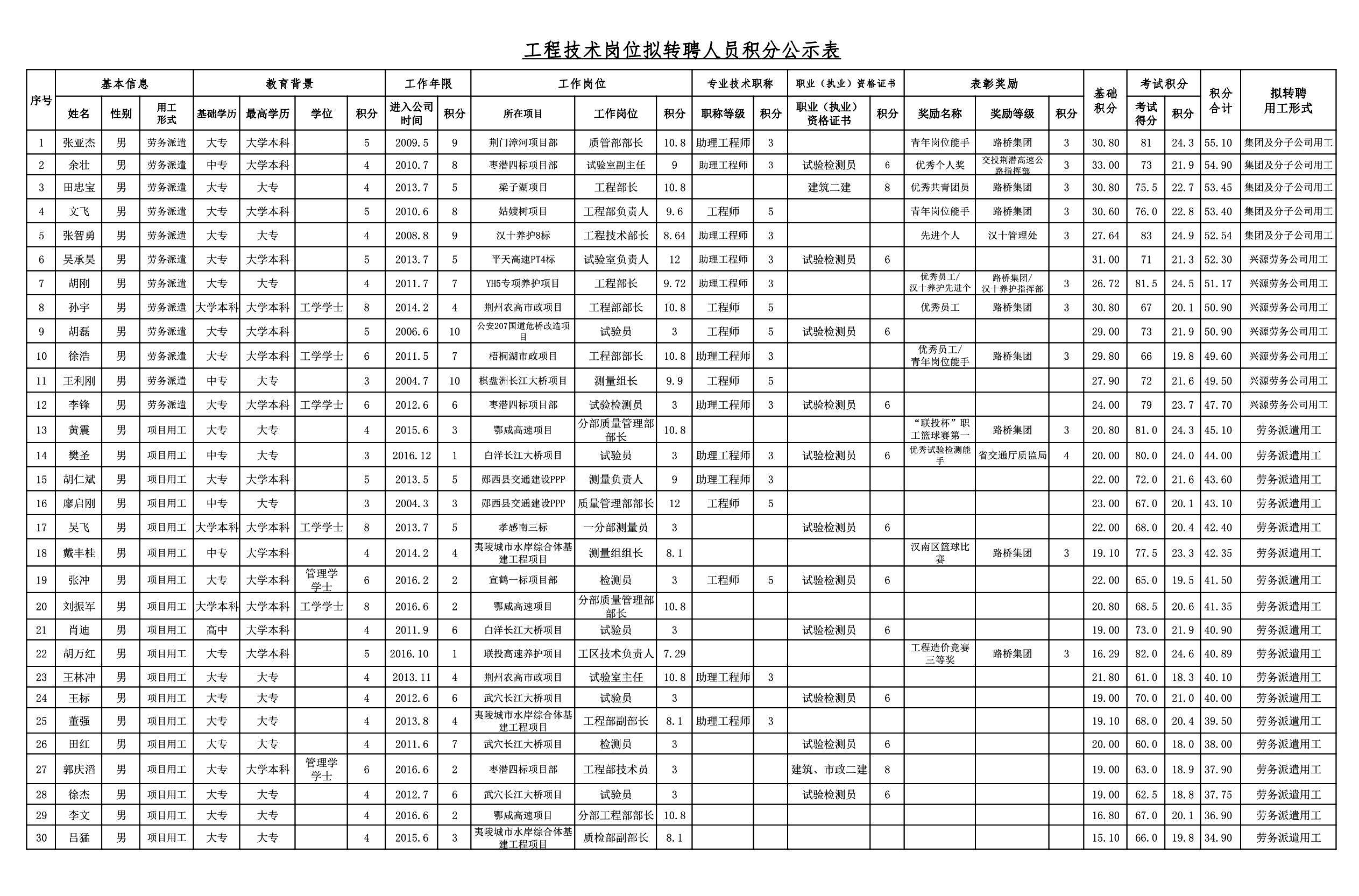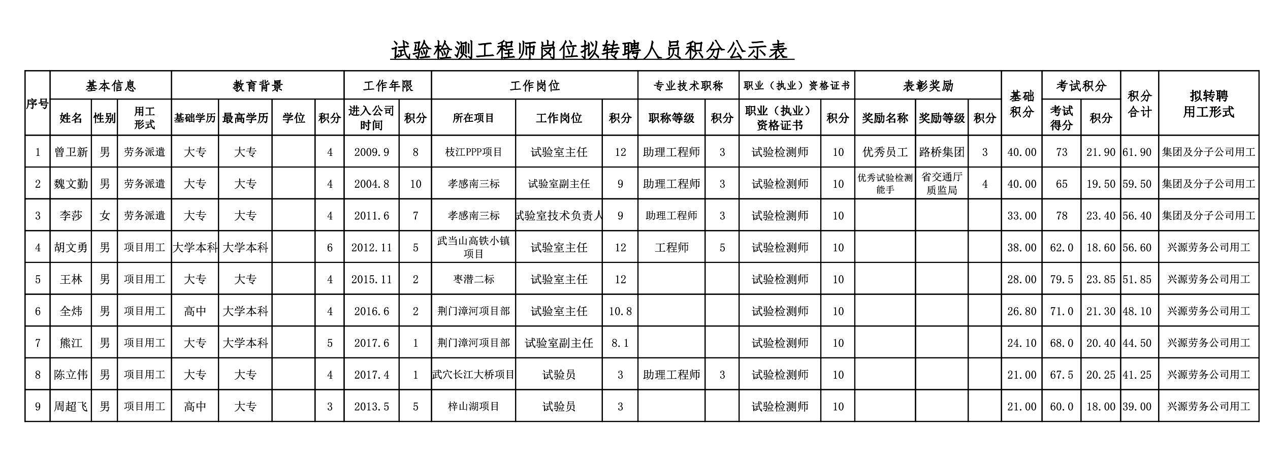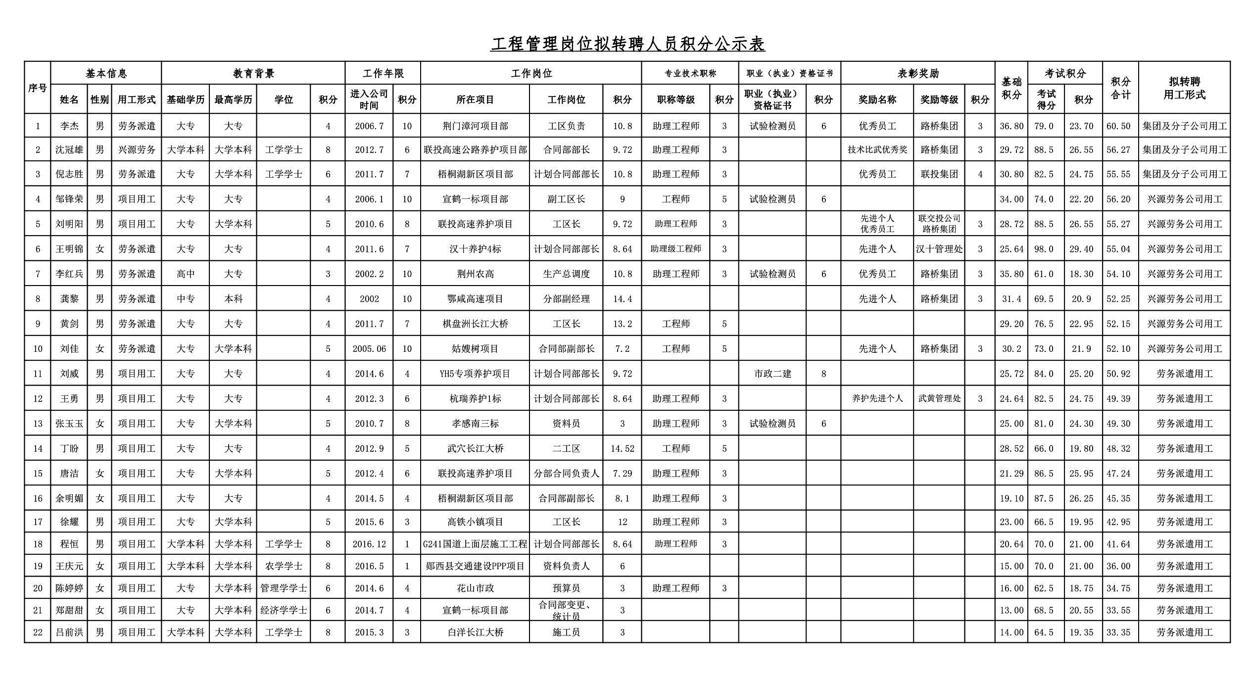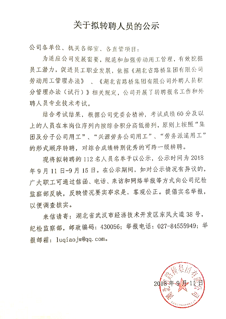 湖北路橋2018年關于擬轉聘人員的公示