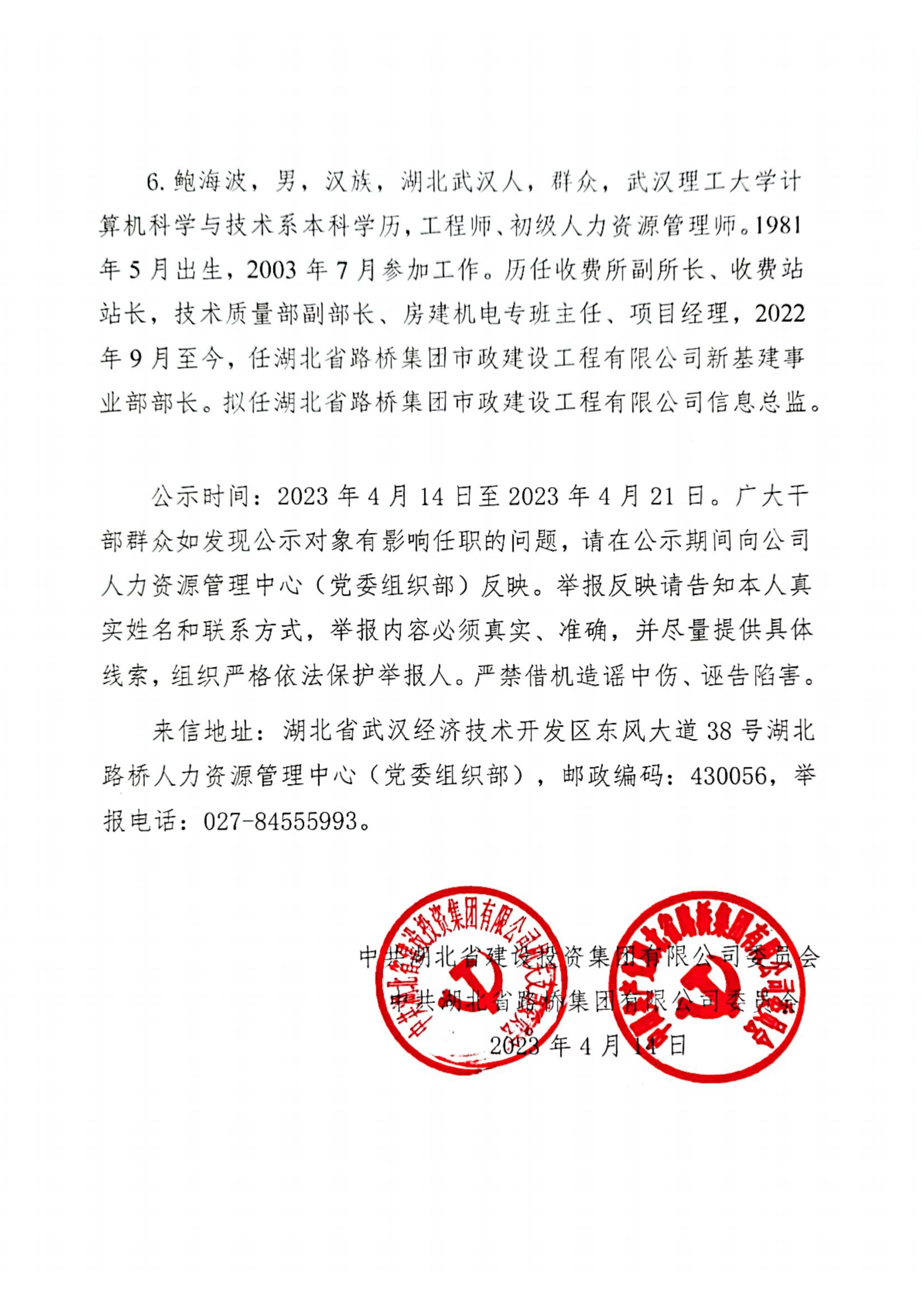 湖北省路橋集團有限公司擬提拔任用中層管理人員任前公示