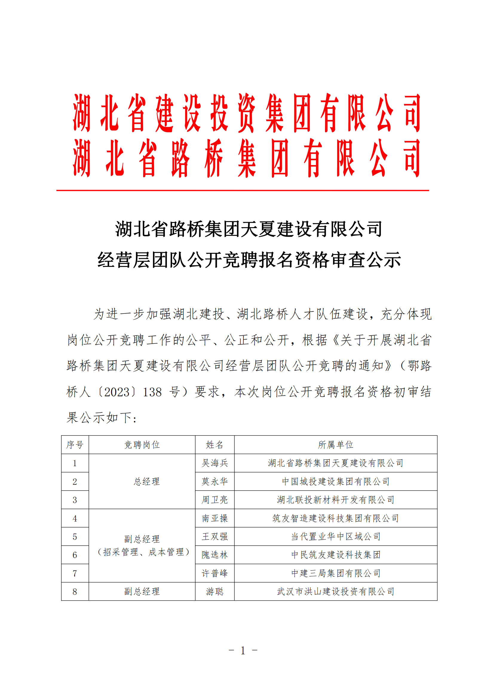 湖北省路橋集團天夏建設有限公司經營層團隊公開競聘報名資格審查公示