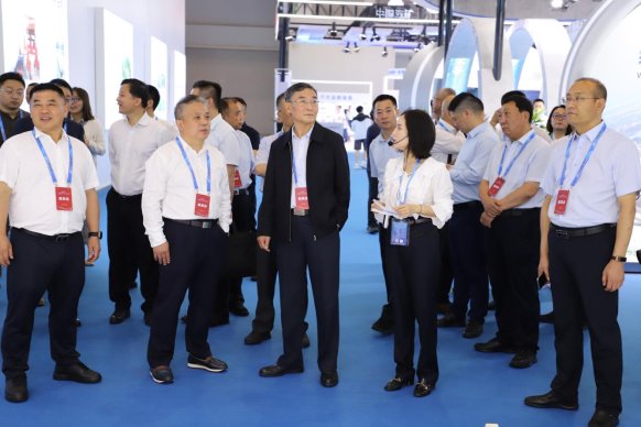 圖:中國交通運輸協會副會長兼秘書長李剛(第一排左三)參觀湖北路橋展臺