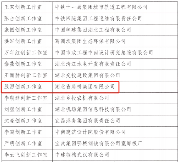 企業榮譽|喜報!湖北路橋“殷源創新工作室”獲評“湖北省職工創新工作室”