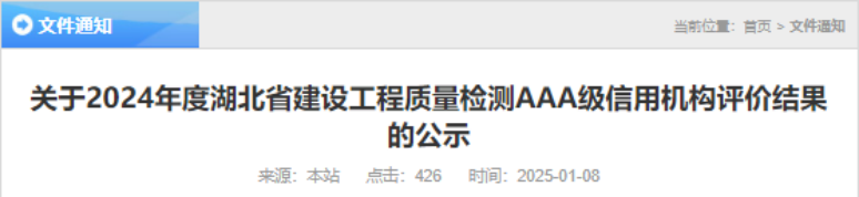 1月8日,湖北省建設工程質量安全協會發布了2024年度湖北省建設工程質量檢測AAA級信用機構評價結果,聯投湖北路橋瑞達科研檢測公司憑借優異的誠信建設和信用管理能力,榮獲最高級“AAA級”信用機構評價。