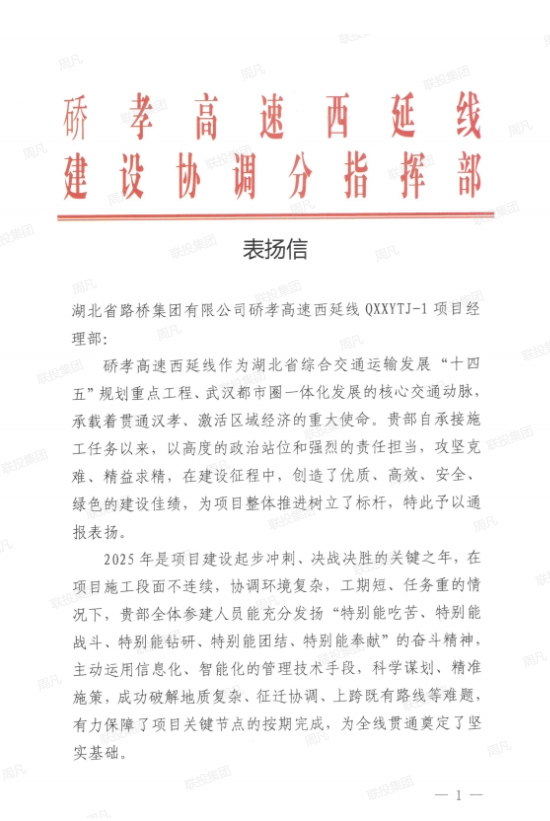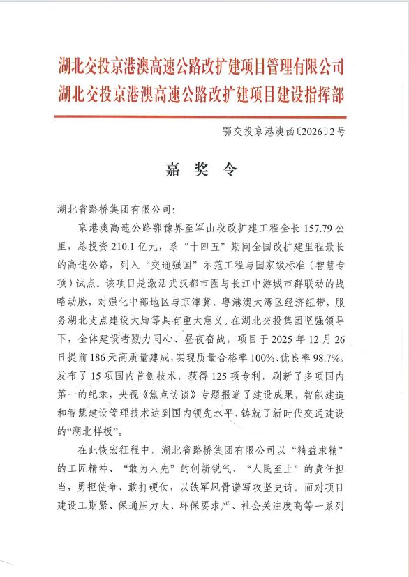 京港澳改擴(kuò)建項(xiàng)目指揮部對(duì)湖北路橋京港澳改擴(kuò)建1標(biāo)項(xiàng)目建設(shè)中做出的突出貢獻(xiàn)予以通令嘉獎(jiǎng)。該項(xiàng)目是“十四五”期間全國(guó)改擴(kuò)建里程最長(zhǎng)的“交通強(qiáng)國(guó)”示范工程,對(duì)激活武漢都市圈與長(zhǎng)江中游城市群聯(lián)動(dòng)的戰(zhàn)略動(dòng)脈,對(duì)強(qiáng)化中部地區(qū)與京津冀、粵港澳大灣區(qū)經(jīng)濟(jì)紐帶,服務(wù)湖北支點(diǎn)建設(shè)具有重大意義。項(xiàng)目建設(shè)期間,湖北路橋圓滿出色完成建設(shè)任務(wù),成功鑄就新時(shí)代交通建設(shè)“湖北樣板”。
