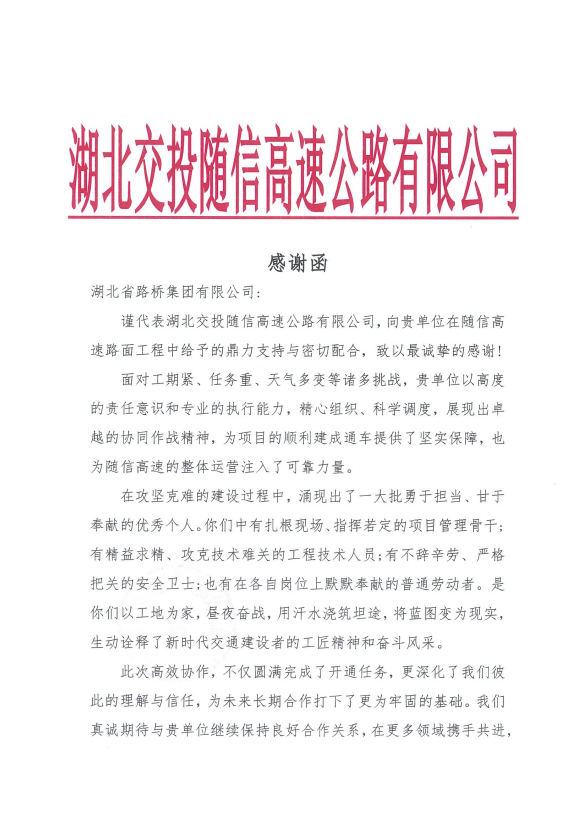 篤行實(shí)干結(jié)碩果,新春傳喜譽(yù)滿途。在2026年新春佳節(jié)來(lái)臨之際,湖北路橋相繼收獲來(lái)自各協(xié)會(huì)、政府、指揮部、項(xiàng)目辦的感謝信與表?yè)P(yáng)。這份來(lái)自各方的認(rèn)可,是對(duì)公司深耕基建、匠心筑路的最好回饋,更生動(dòng)詮釋了“筑路架橋、造福社會(huì)”的企業(yè)使命。